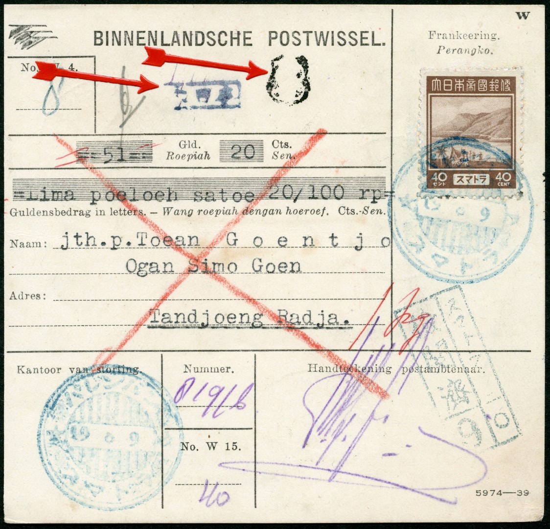 40 Cent definitive no. 010 on M.O. Bu.JF1a with signet ring of postmaster Boestam and framed Dai Ni Hon overprints 523z (in this case not locally used in Sekajoe) and 82b, from Palembang 19.8.9 (type 221 in blue) to Tandjongradja 19.8.12. Censor Bu.JC15. Rare!