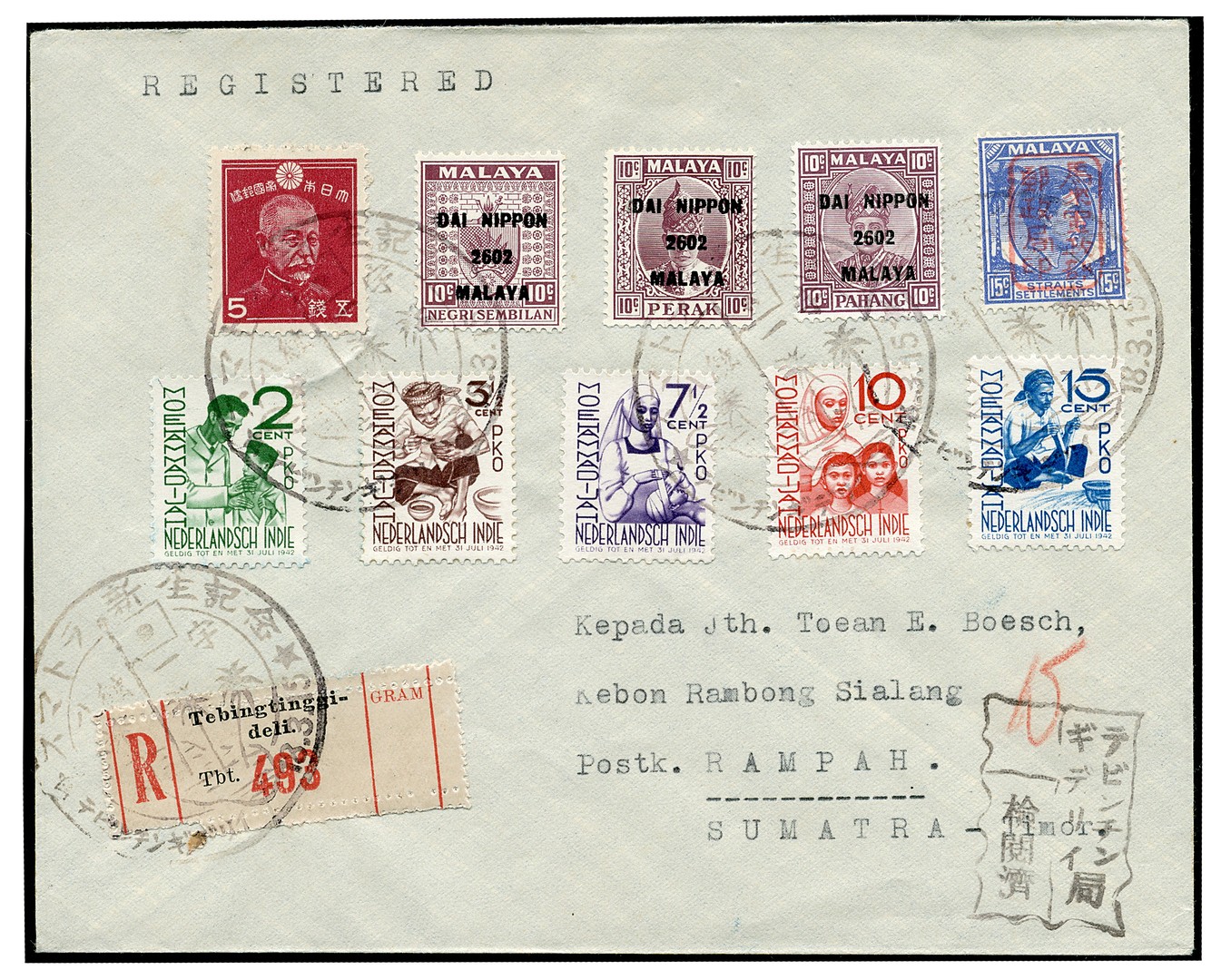 5 Philatelic covers from Sumatra, all bearing a wide variety of stamps, including Japanese J20-J22, and 3 items tied by commemorative cancellations types 415, 435 and 417 which item is illustrated in the Dai Nippon Catalogue of the postage stamps (3rd edition, 2017) on page 93