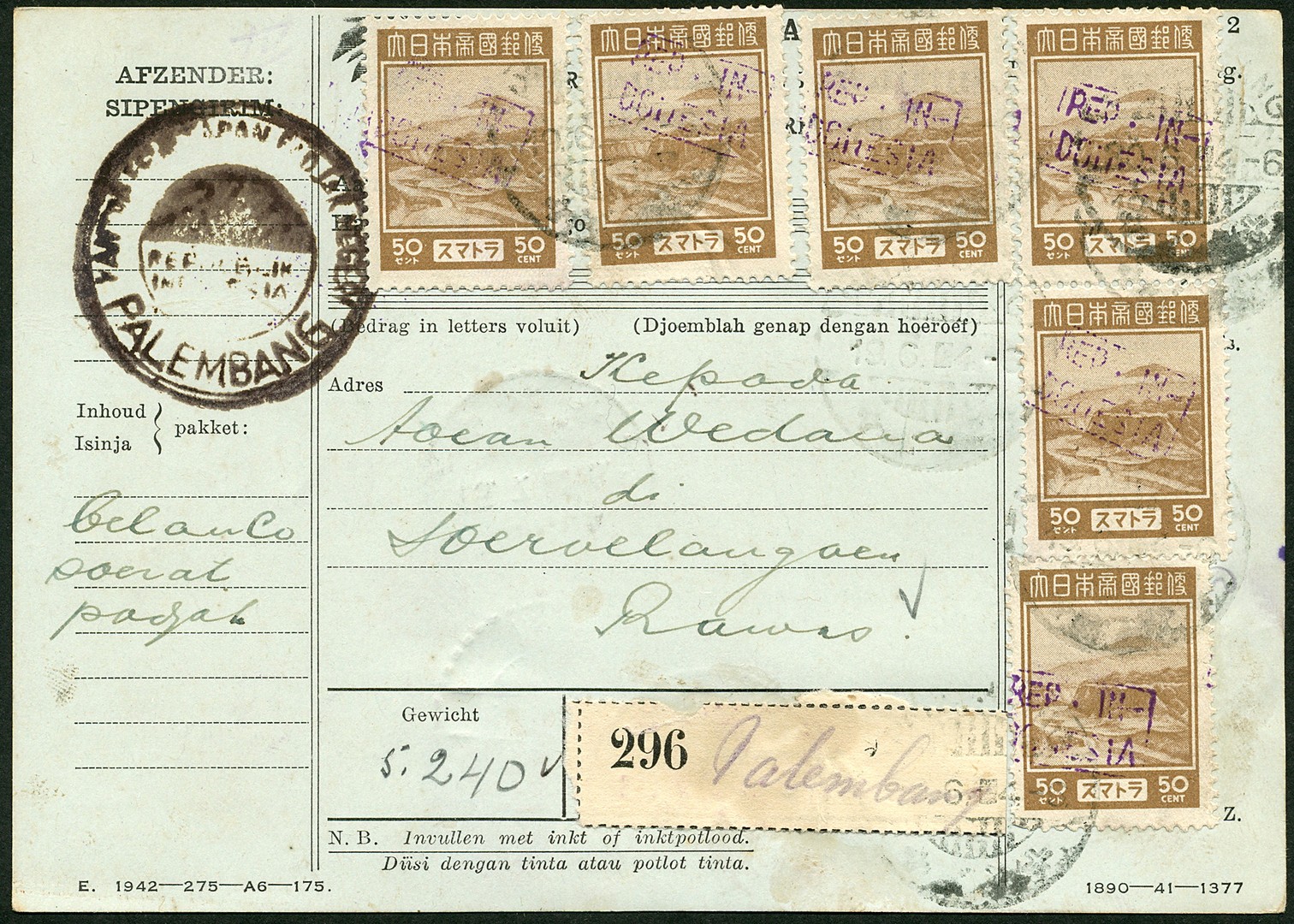 SUMATRA. 50 Cent definitive with violet framed REP. IN- / DONESIA overprint no. 54v-96 (6x) and 40 cent definitive with the same overprint no. 54v-94 (2x on the back) on complete parcel post card Bu.RF40 (scarce) from Palembang 19.6.4.-6 to the small sub-post office of Soeroelangoen / Rawas 1.7.4.6 (backstamped type 010, vNV.R). The circular cachet on the left is not postal but from the sender (tax office of Palembang)