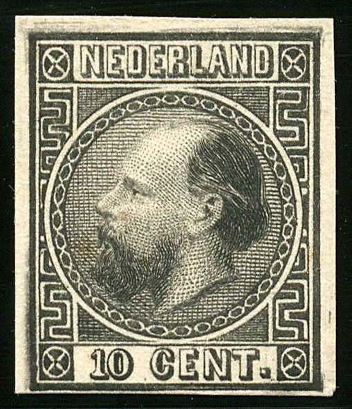 Stempelproef van de 10 cent type I in zwart op wit karton, PC.31. Vrijwel prachtex. ƒ 500