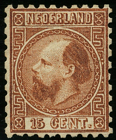 9IIB, 15 cent oranjebruin, Kt.10½ x 10¼, ongebruikt prachtex. qua kleur en tanding, echter gom niet in originele staat. Zeldzaam zegel met cert. NVPH (2003) € 3500