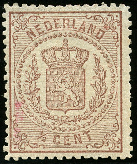 13A, ½ cent bruin op dun papier, Lt.14 kl.g., ongebruikt zeer fraai ex. (rood keurstempeltje iets doorgeslagen) met cert. NVPH (1979) € 3000