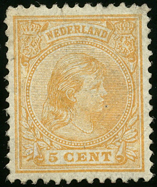 35f, 5 cent oranje in plaats van blauw. Zeldzame kleurafwijking, ongebruikt met gebreken, zoals bij alle van de 14 bekende ex. in meer of mindere mate. Cert. C. Muis (2003) € 5000