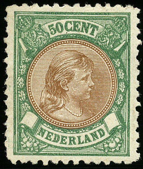 45C, 50 cent donkergroen en bruin, Lt.11, ongebruikt zeer fraai ex. (kort tandje) met 2 certificaten NVPH (1957 en 2004). Uiterst zeldzaam zegel! € 3150