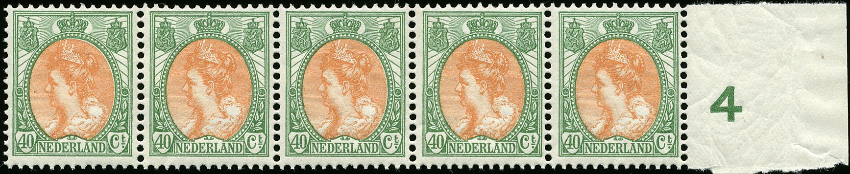 73, 40 cent groen en oranje, luxe postfrisse strip van vijf € 625