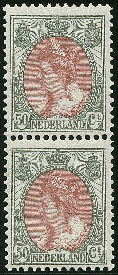 74, 50 cent bronsgroen en bruinrood, postfris verticaal prachtpaar met cert. NVPH (2017) € 1100