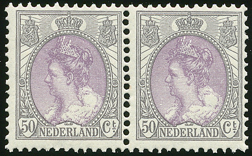 75, 50 cent grijs en violet en 76, 60 cent olijf en groen, beide in postfrisse prachtparen € 730