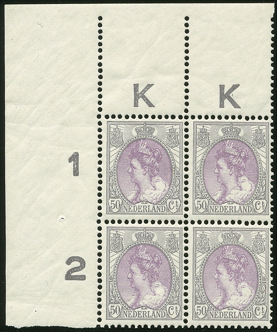 75, 50 cent grijs en violet, in luxe postfris hoekblok van vier € 960