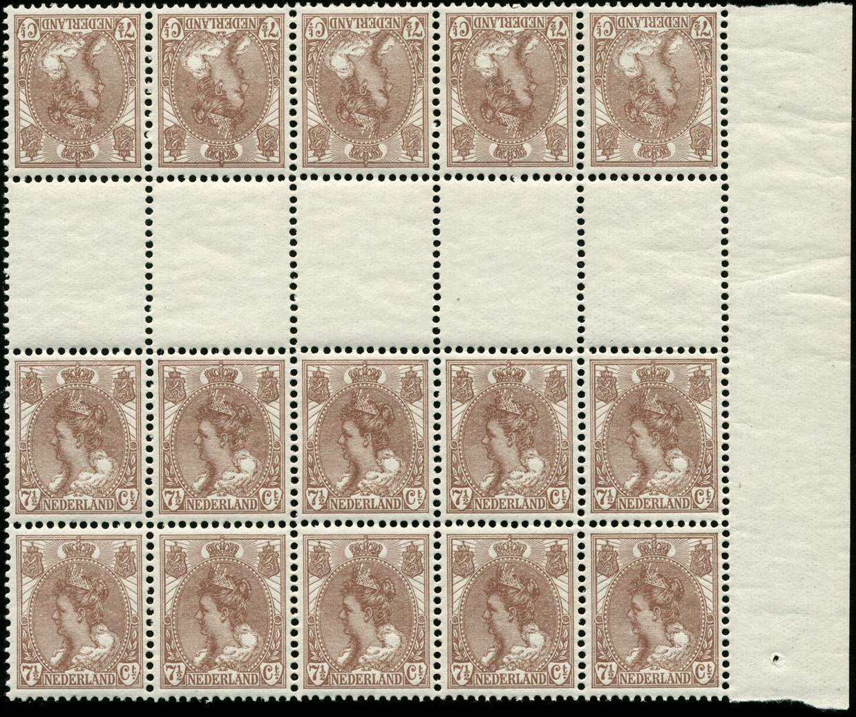 61c, 7½ cent bruin, keerdrukpaar met witte tussenstrook in luxe blok van 5 stroken. Zeldzaam! € 4250