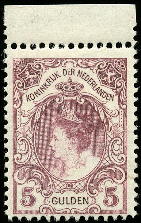 79D, 5 Gulden wijnrood, Lt.11½, postfris prachtex. met bovenvelrandje, met cert. Moeijes (1986) € 925