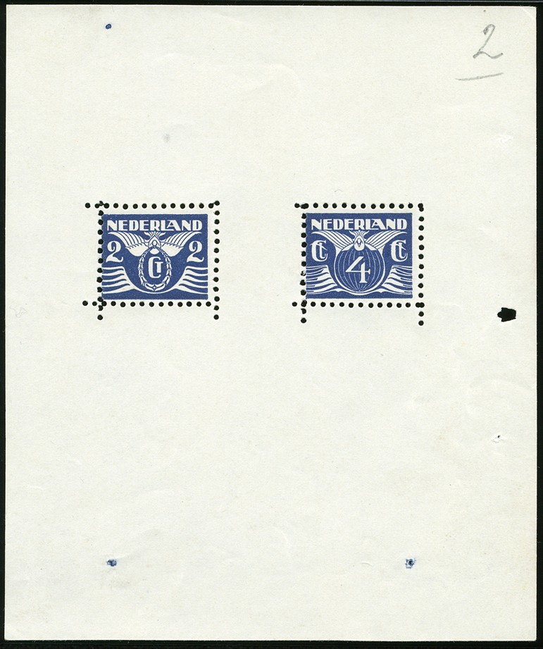 Lebeau 1924. Niet goedgekeurde ontwerpen voor de waarden 2 en 4 cent, tezamen op een crèmekleurig velletje van ca. 100 x 200 mm, lijntanding 11, ongegomd, met knip, in zwartachtig lilaultramarijn (Mi.29-23-8). Als PC.207