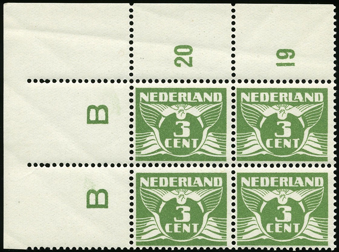 144/148, Vliegende Duif zonder watermerk, in postfrisse pracht hoekblokken met randbedrukkingen € 440