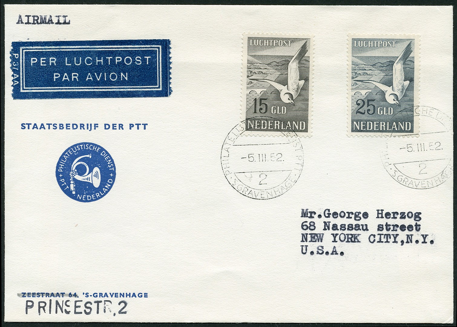 12/13, 15 en 25 gulden Meeuwen, prachtex. op couvert van de Philatelistische Dienst op 5 maart 1952 per luchtpost verzonden naar New York. Schaars!