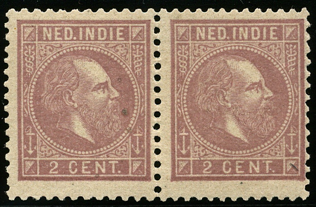 5G + 5F, 2 cent lilabruin in de gecombineerde tanding 11½ x 12 - 12½ x 12, postfris egaal getint met klein roestpuntje en tanding iets los, doch uitermate schaars paartje met certificaat Bakker (1998) € 1500 (cursief voor *)