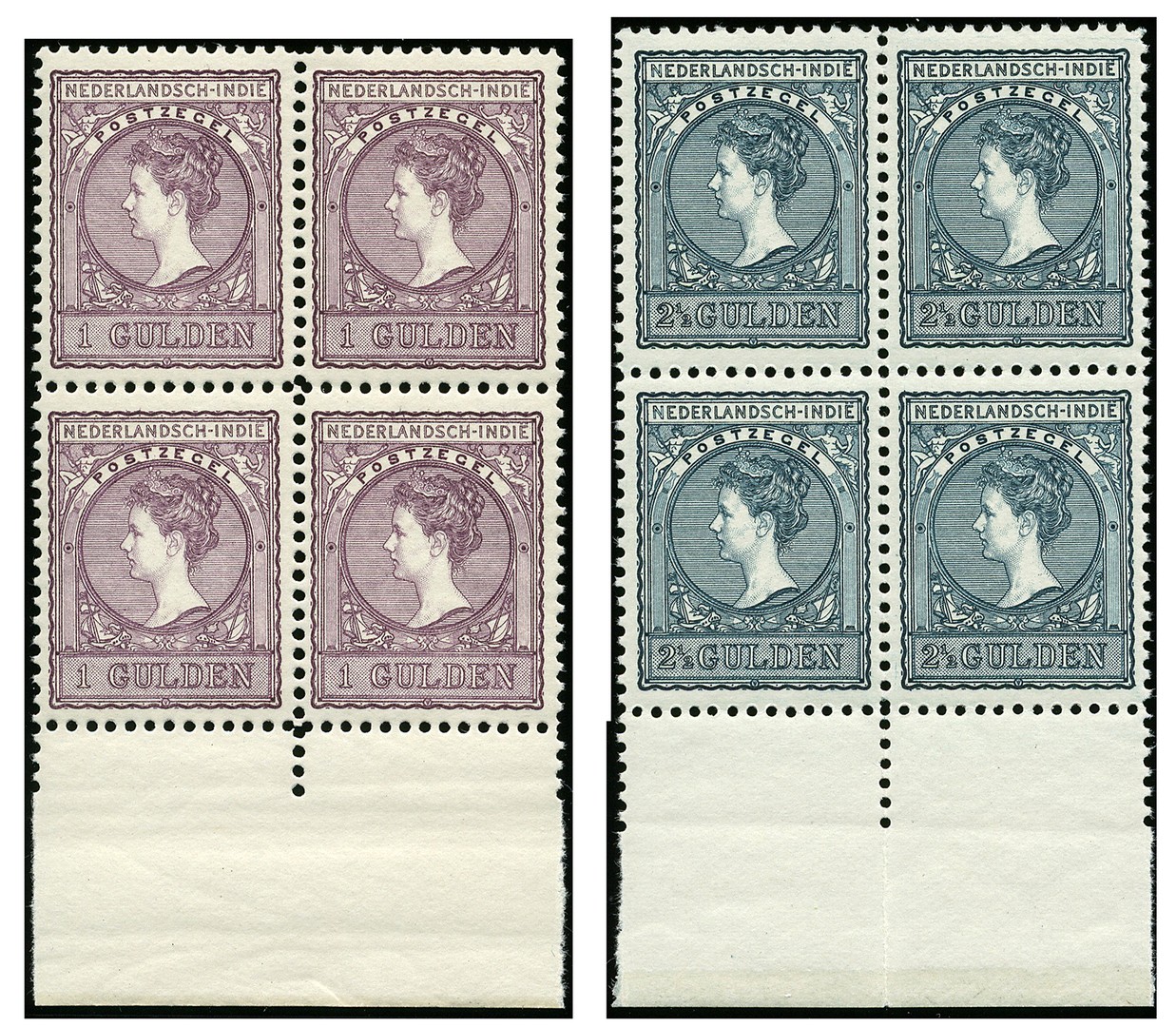 58A/59C, type Veth, 1 gulden in lijntanding 11 en 2½ gulden in lijntanding 11½ x 11, postfrisse pracht randblokken van vier. € 2500+