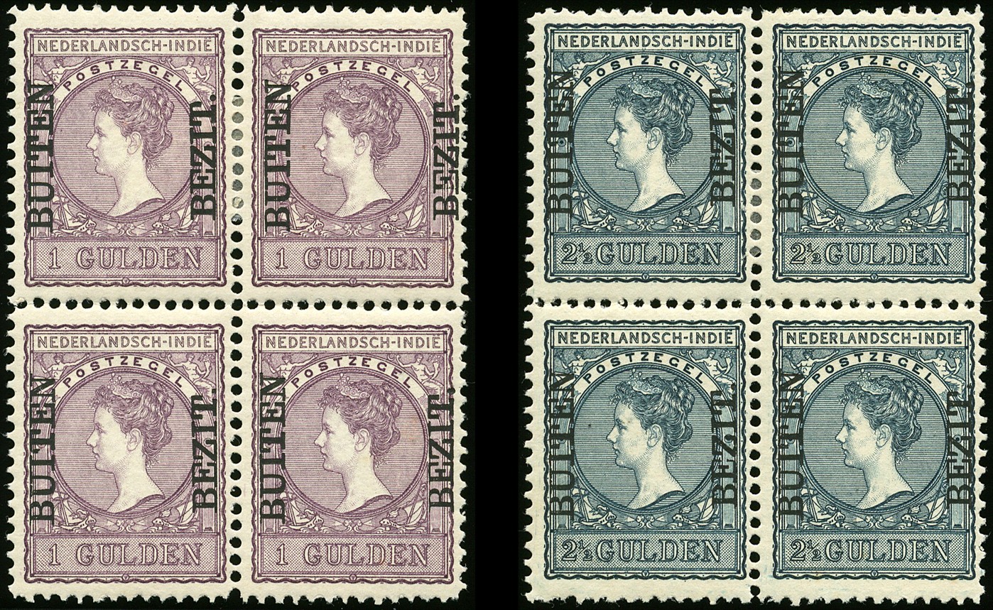 81/98, ½ cent t/m 2½ Gulden met opdruk Buiten Bezit, compleet in blokken van vier (½ cent in blok van 20, en 1 cent in blok van 6) waarbij de twee onderste zegels postfris, beh. een enkele klein verwaarloosbaar bruin puntje een prachtset in mooie kwaliteit € 2700 +
