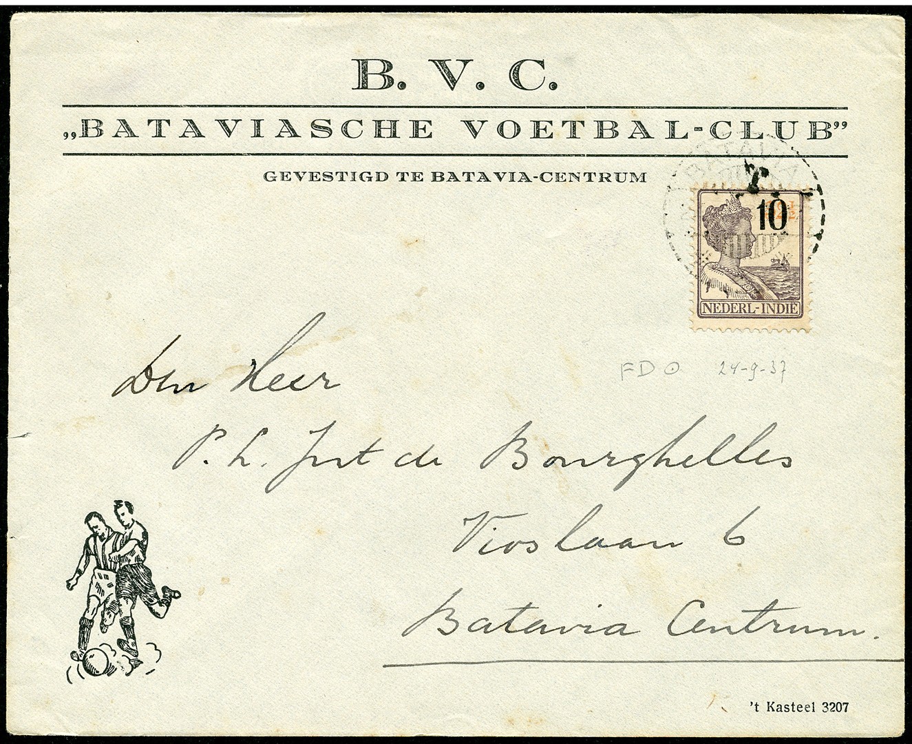 229, Hulpuitgifte 10 op 32½ cent op mooi couvert van de B.V.C. met eerste dag-afstempeling Batavia 24-9-1937 (tevens op az. een duidelijke afdruk). Schaars!