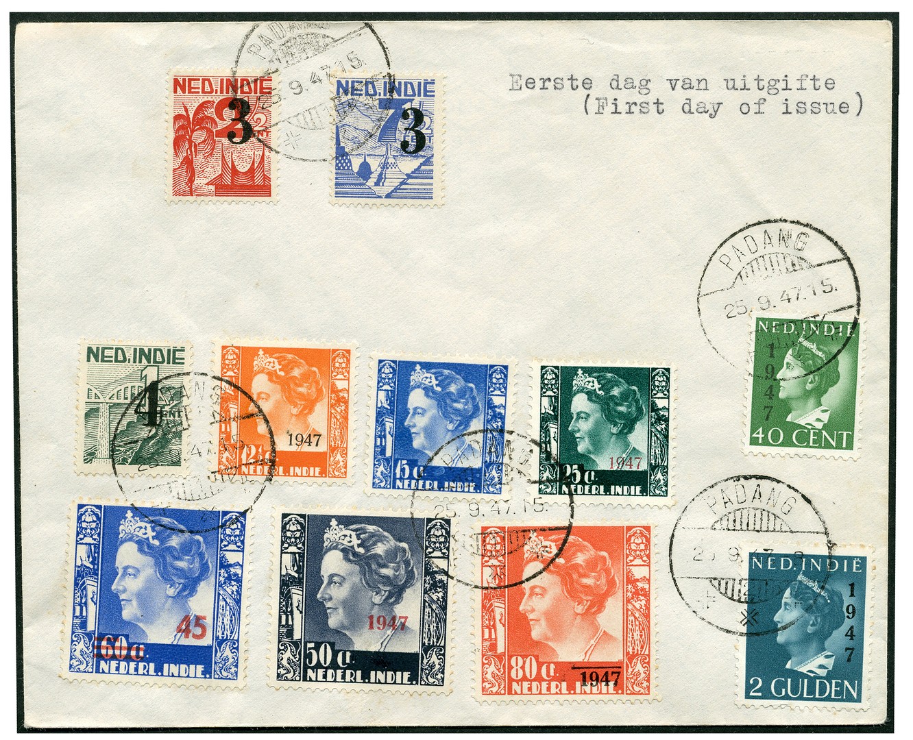 322/25, Hulpuitgifte, en 326/32 opdruk '1947', op open couvert met eerste dag-afstempeling Padang 25-9-1947. Zeer zeldzaam, Avezaat RRR