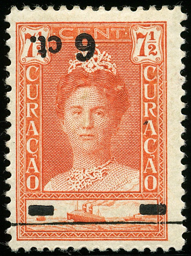 100f, 6 ct. op 7½ ct., ongebruikt prachtex. met kopstaande opdruk en cert. Ned. Bond (1980) € 350