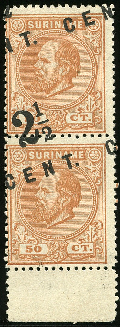 21Aa, 2½ cent op 50 cent Kt.14 kl.g., in ongebruikt verticaal prachtpaar € 500