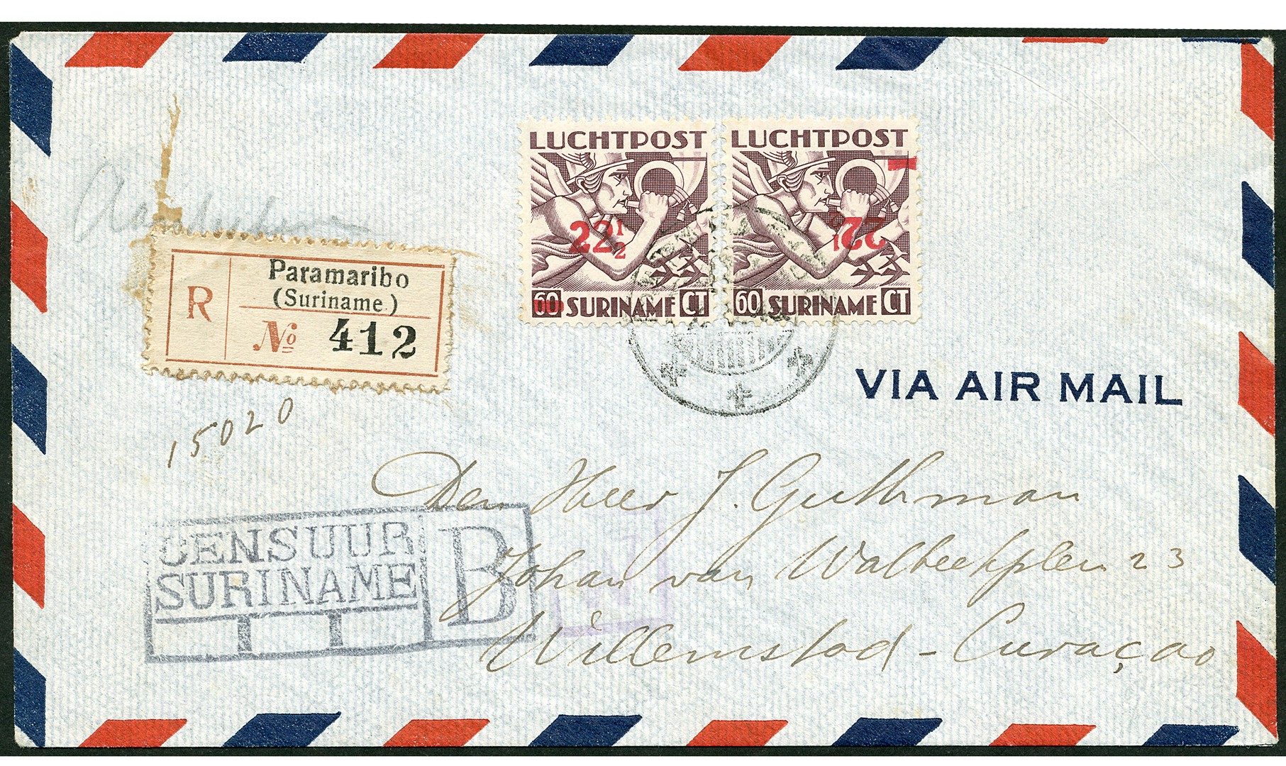 LP24fa, 22½ op 60 cent donkerviolet, met kopstaande opdruk, i.c.m. LP24 op aangetekende LP.-brief van Paramaribo 7/5/45 naar Curaçao € 400