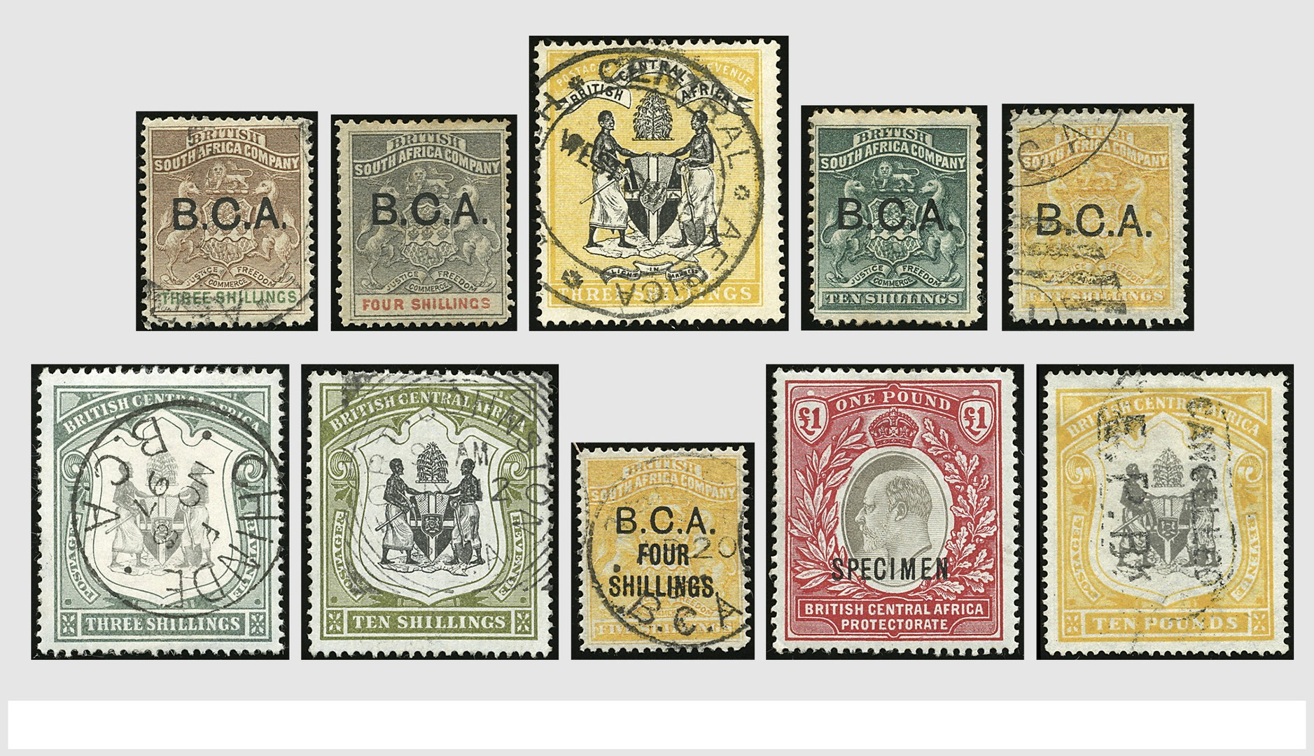 ENGELSE KOLONIËN, British Centraal Afrika, mooie verzameling o/* op albumbladen met S.G. 1/13, 19/20, 43/50a, 52 met speciaal stempel (fiscaal?), 63/64, 65/66 met Specimen-opdruk. Het geheel in mooie kwaliteit