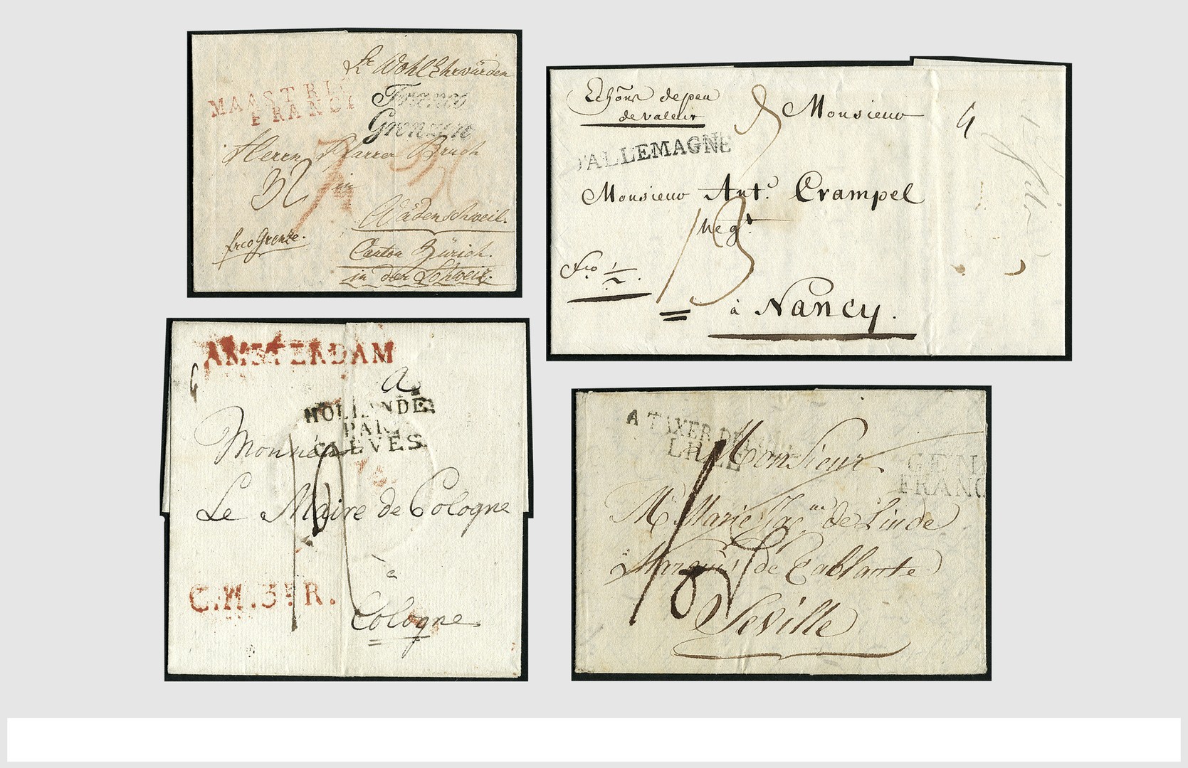 POSTHISTORIE, collectie van 52 brieven 1751-1819 van de Noordelijke en Zuidelijke Nederlanden met een verscheidenheid aan postale notities w.o. portaanduidingen, stempels w.o. 3-stuiver, naam- en departementsstempels, déboursé, Port Payé, P.P.P.P., grenskantoorstempels w.o. 'Hollande' en 'D'Hollande', militair, Paardenposterij, portvrijdom, routes en bestemmingen, etc. etc. waarvan diverse brieven deskundig beschreven en allen in prachtkwaliteit, in ringband. Ex Van den Brink