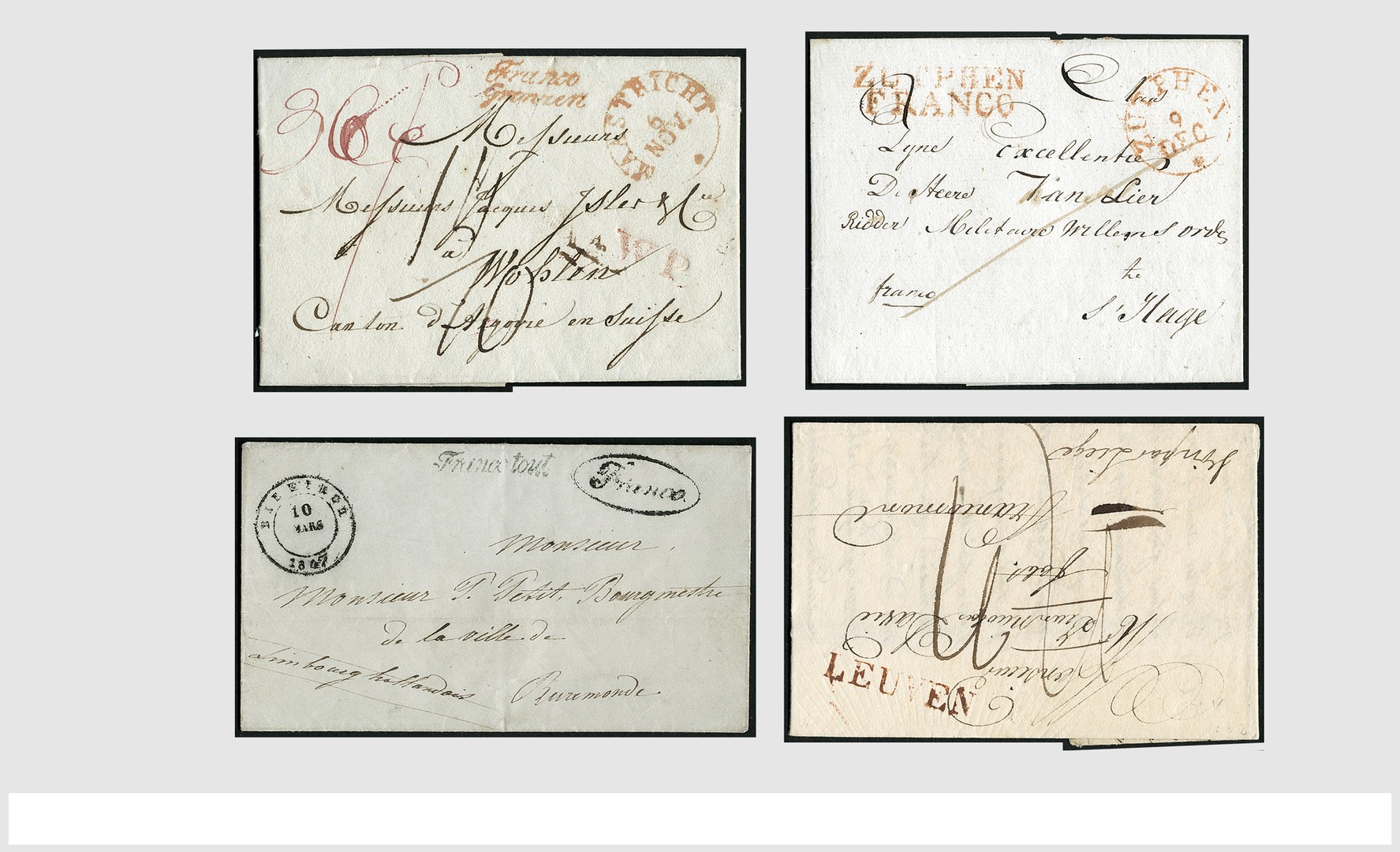 POSTHISTORIE. Tentoonstellingscollectie 'Nederland 1813-1852' van A.H.M.H. van den Brink, bestaande uit 95 poststukken, uitsluitend in uitgezochte luxe kwaliteit en zeer gedocumenteerd beschreven met betrekking tot de postale aanduidingen, portverklaringen, routes, afstempelingen, historische betekenissen etc. Een prachtobject om uit te breiden, in 3 ringbanden. Iedere liefhebber van de oude Nederlandse postgeschiedenis adviseren wij de collectie goed te bekijken