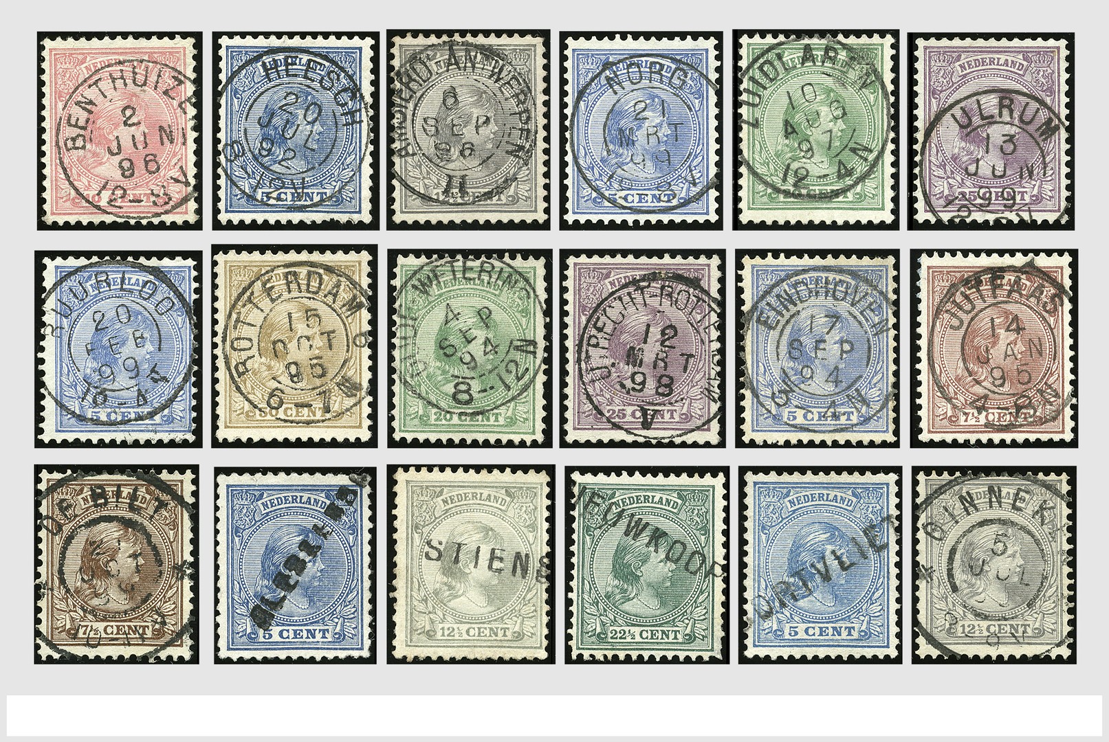 1891-1894, Emissie Hangend Haar, restant van een zeer uitgebreide gebruikte, gespecialiseerde tentoonstellingscollectie met oplagen, kleurschakeringen, papier, plaatfouten, stempels, post(waarde)stukken, etc. in 3 Safe-ringbanden. Ex Wittpen. Heeft gediend als studie- en illustratiemateriaal voor behandeling in HPN