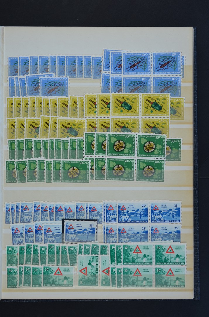 NED. NIEUW-GUINEA, voorraadstock o/** in 2 insteekboeken w.o. eenheden en veel met velrand waarvan diverse met telcijfers en markeerboogjes, gebruikte blokken van vier en diverse zegels met bijgevoegde notities van F. Bender