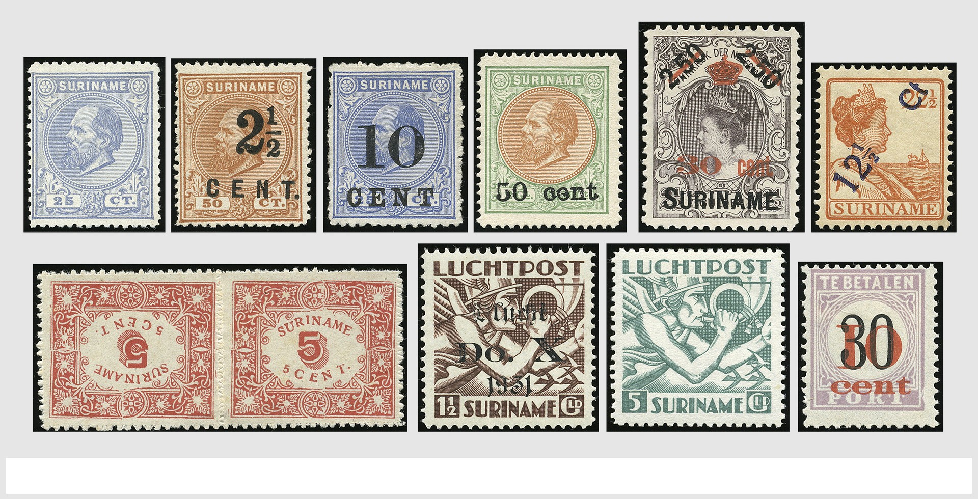 SURINAME 1873-1975, mooie complete ongebruikte resp. postfrisse verz. in Davo album, o.a. 1/15 (10a 2x), 21A, 32a (met cert.), 37/40, 58a/59a, 60/64, 104/110, Luchtpost en Port (beide compleet), het geheel in nette kwaliteit