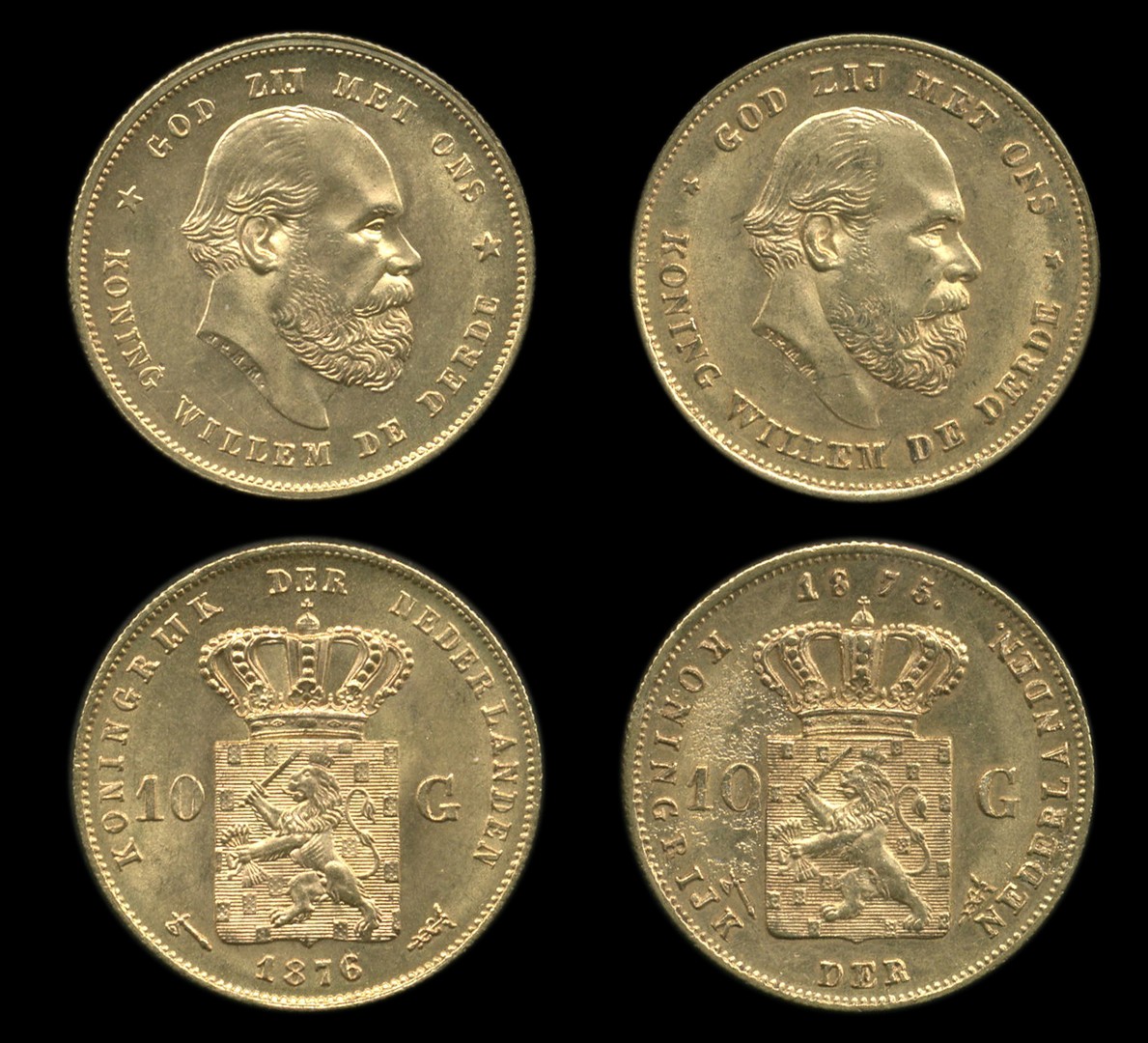 NEDERLAND, Gouden 10 Gulden Willem III 1875 (Sch. 549), en 1876 (Sch. 550) beide pracht