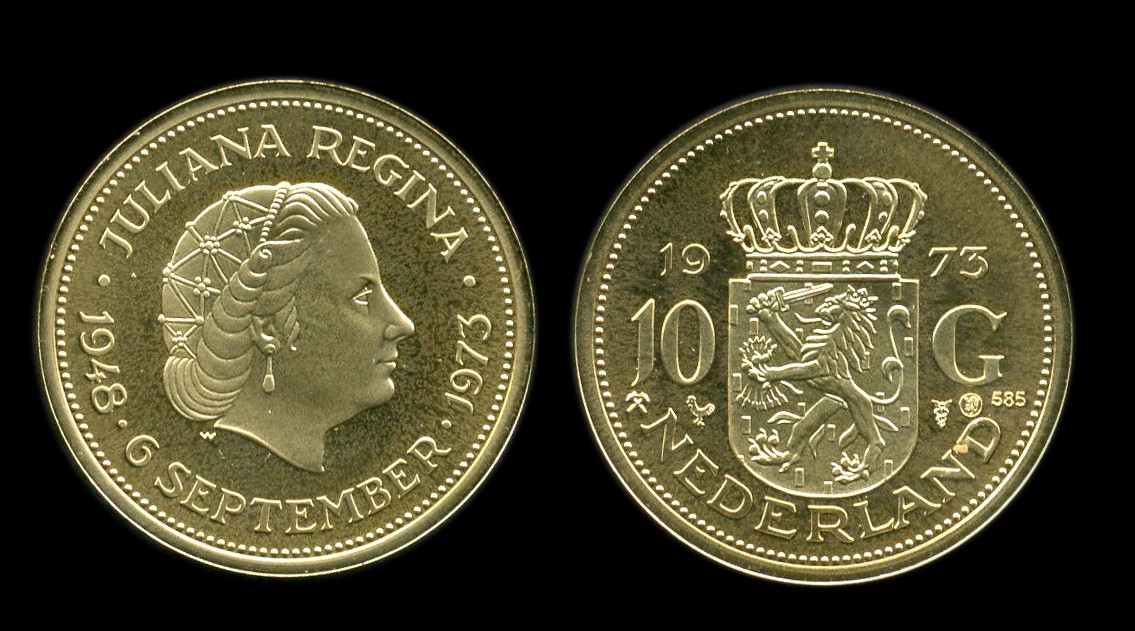 NEDERLAND, Herslag van het nooit verschenen herdenkingstientje 1973 in 14 Karaats Goud