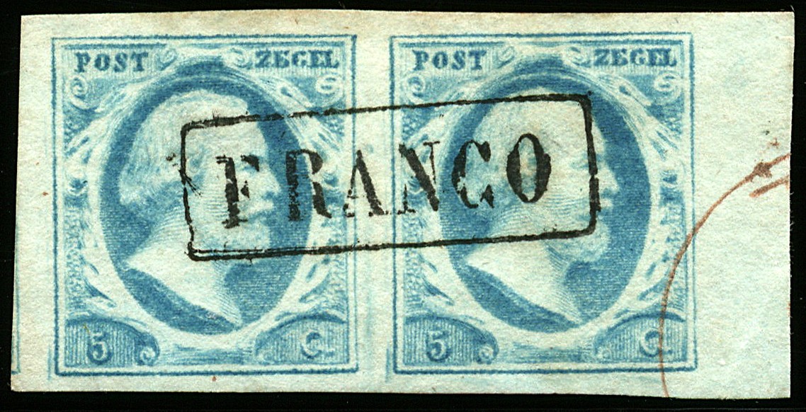 1o-Pl.V-54/55. Zeer breed gerand, beschaafd gestempeld pracht randpaar (rechtsonder in velrand, ver van zegelbeeld, uitgestreken niet storend hoekvouwtje)