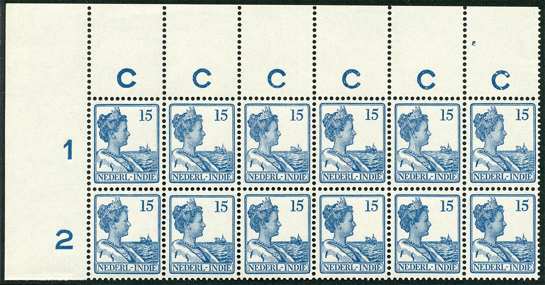 118, 15 Cent blauw in postfris pracht hoekblok van twaalf, oplageletter C. € 600