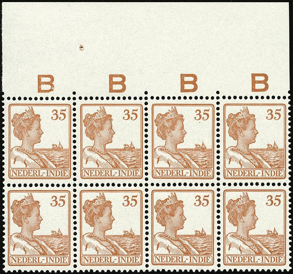 127, 35 Cent roodbruin in postfris randblok van acht met oplageletter B. € 400