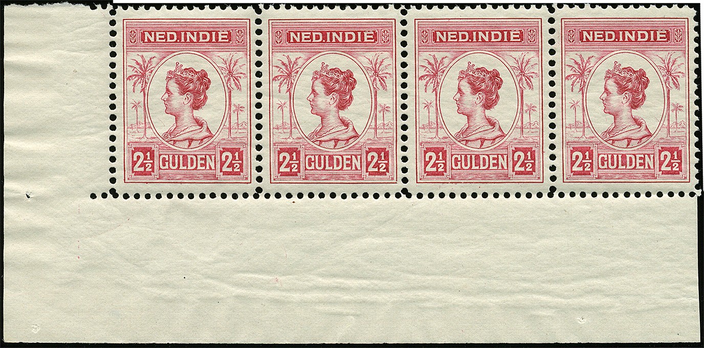 134A, 2½ Gulden in lijntanding 11 x 11½ in postfrisse pracht hoekstrip van vier. € 320
