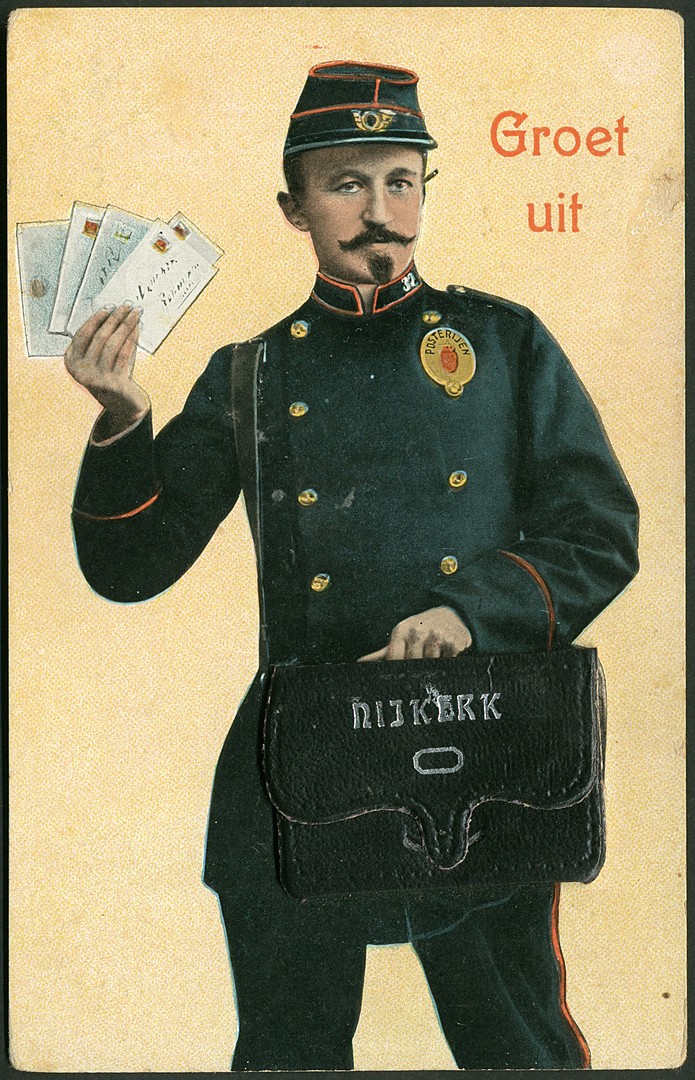 Mooie prentbriefkaart van een besteller met een lederen tas, waarin een serie fotootjes van Nijkerk, niet verzonden