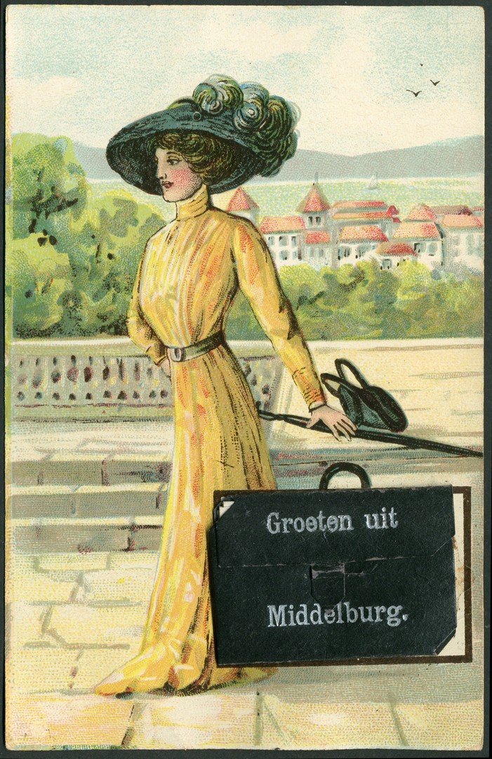 Aardige prentbriefkaart van een dame met een lederen tas, waarin een serie fotootjes van Middelburg, niet verzonden