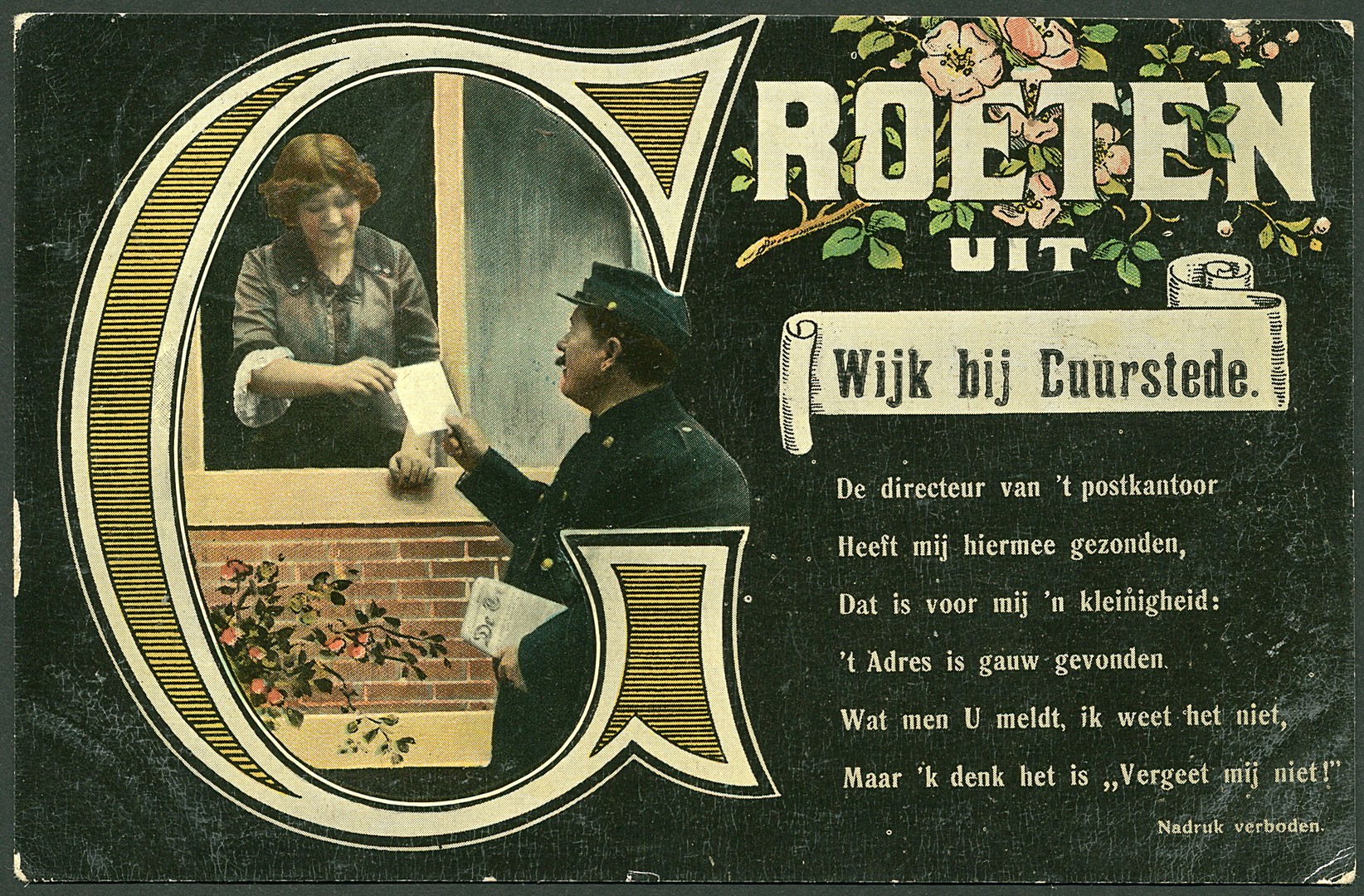Vrolijke prentbk. van een dame bij het raam, die door de postbesteller wordt verwend... met een kaartje, van Wijk bij Duurstede 27-7-1914 naar een mejuffrouw in Watergraafsmeer