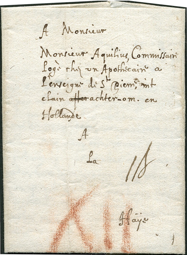 Corsini. Cpl. zeer frisse vouwbrief van Londen 30-12-1649 naar Den Haag met op vz. in rood krijt geschreven port ´XII´