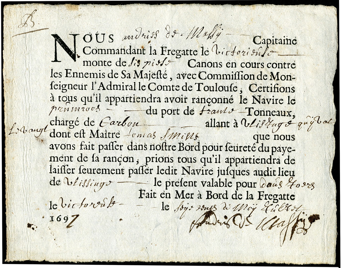 Negenjarige Oorlog 1688-1697. Vrijgeleidebrief uit 1697, afgegeven op zee door een Franse kaper aan het Nederlandse schip ´de Prumroos´ om door te mogen varen naar Vlissingen, nadat kapitein Tomas Smits tegen losgeld op het kaperschip in gijzeling was genomen