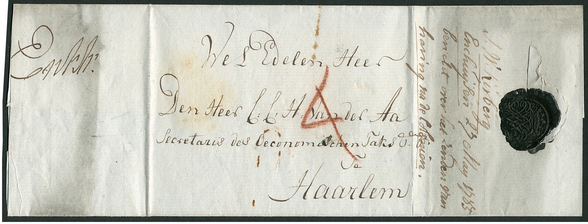 Geschreven kantoren van Alblasserdam (PEP.10010-01, omslag met bijgesloten brief van 6-6-1804 als entre poste, type K.1?), Enkhuizen (PEP.6090-01, gedateerde omslag 1785) en Kuinre (PEP.7164-aa02, vouwbrief 1837). Tevens mooie brief van Utrecht 3-6-1781 naar Haarlem, betreffende een molen tot zuivering van katoen