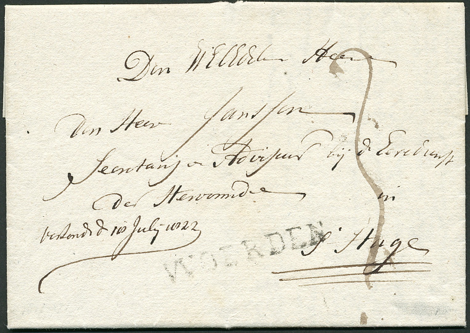 Briefomslag zonder frankeerzegel van WASSENAAR (az. naamstempel in schreefletters in zwart) via Leiden 18-2-1862) naar Sassenheim (az. naamstempel in schreefletters in zwart), alsmede complete zeer frisse vouwbrief van Woerden 18-7-1822 naar Den Haag