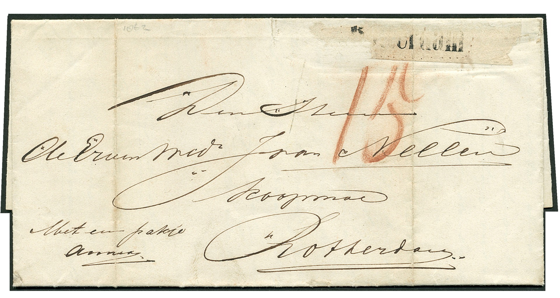 Cpl. vouwbrief ´Met een pakje annex´ (sigaren, tabak) van Arnhem 22-2-1862 naar een koopman te Rotterdam, met op vz. in rood krijt 15´ (op het deels verwijderde label rechtsboven staat gedrukt ´Rotterdam´)