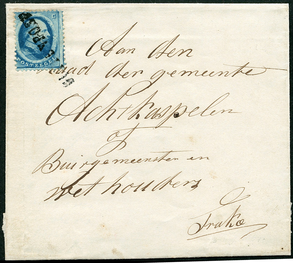 Naamstempel BUITENPOST op 5 cent. Vrijwel prachtex. (Het lijkt ons dat de zegel op de briefvouw is geplakt) op incomplete, ongedateerde vouwbrief uit Augustinusga naar de burgemeester en wethouders der gemeente Achtkarspelen te Buitenpost. Naamstempel Buitenpost zeer zeldzaam op deze zegel, waarschijnlijk uniek op brief