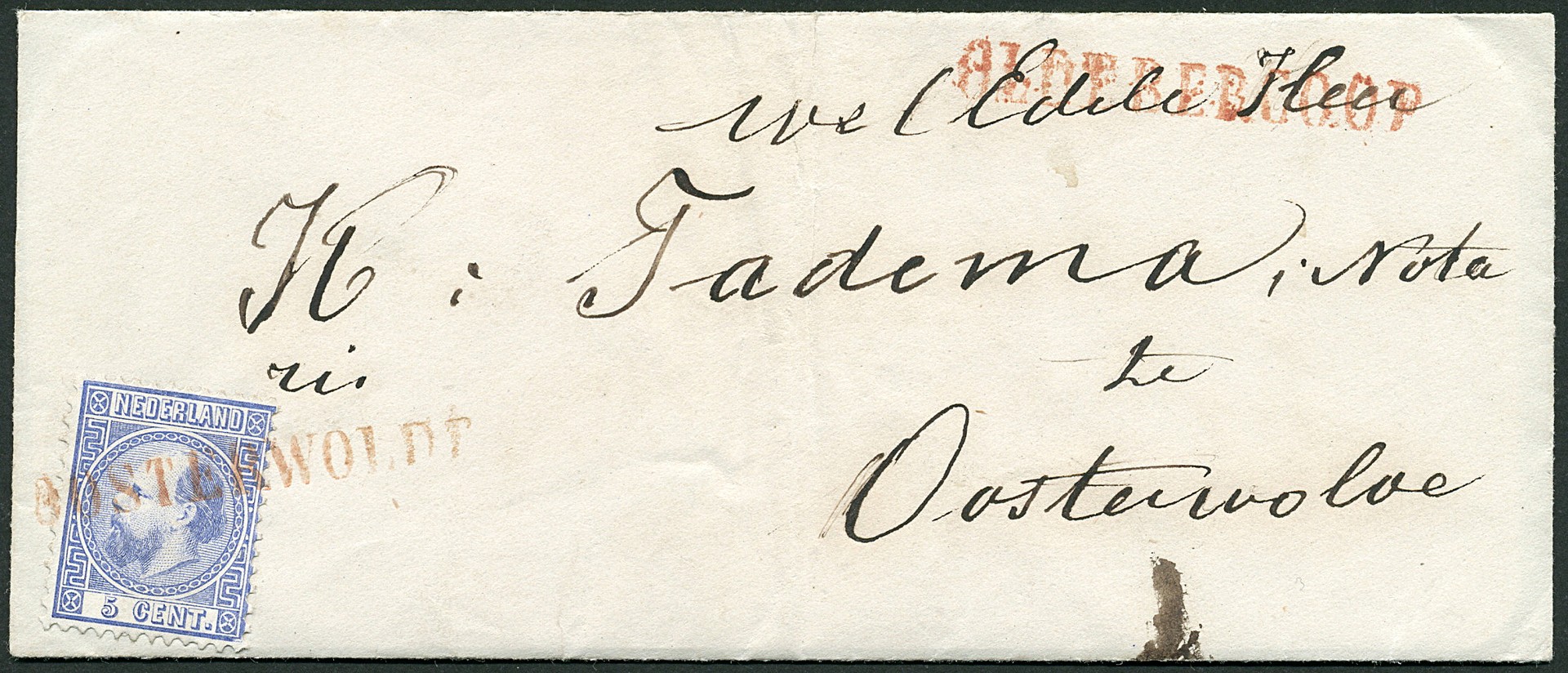 Naamstempel OOSTERWOLDE in schreefletters in rood op 5c nr. 7. Prachtex. met mooie afst. op dichtgeplakt, ongedateerd couvert van OLDEBERCOOP (rechtsboven) naar Oosterwolde