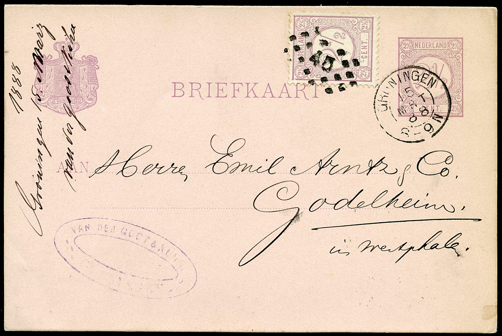 Bk. G23 van Groningen 15-3-1888 naar Godelheim (D), waarvan de bijgeplakte zegel met puntstempel 45 is afgest.
