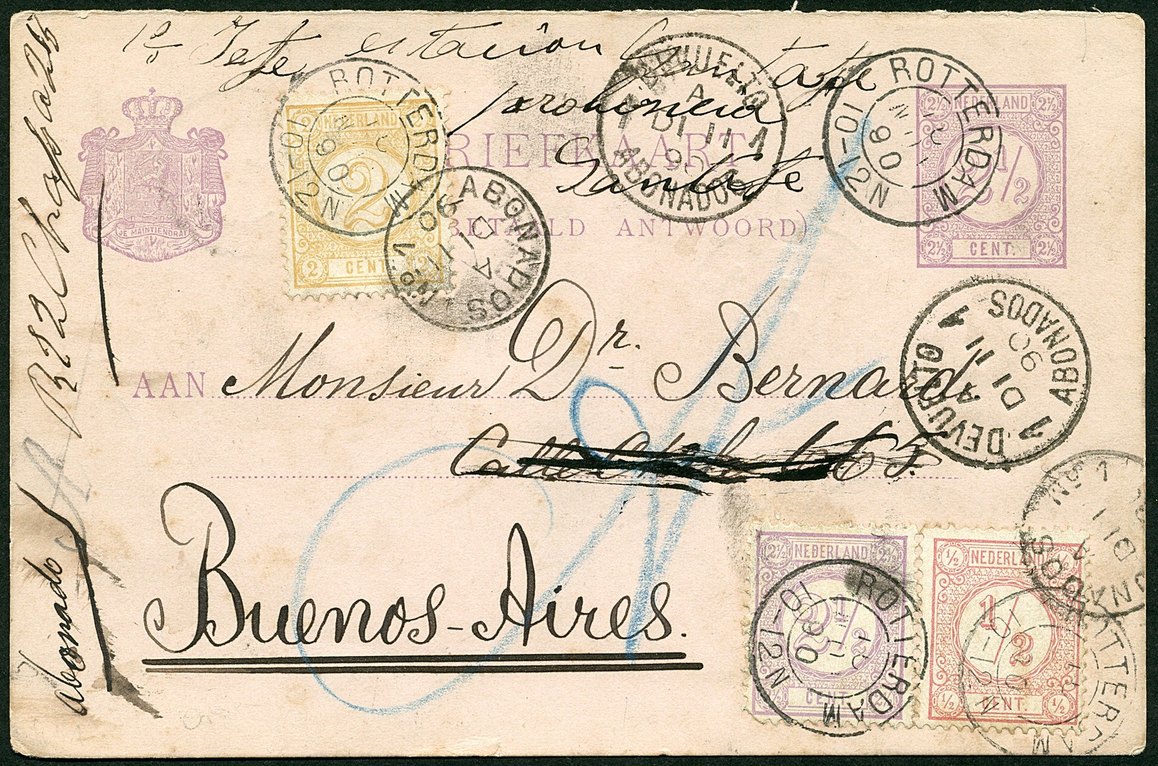 V-kaart G24 met driekleuren-bijfrankering van ½c, 2c en 2½c (mist hoektandje) van Rotterdam 16-11-1890 op zoek naar de geadresseerde in Buenos Aires met op vz. en az. een achttal Argentijnse stempels