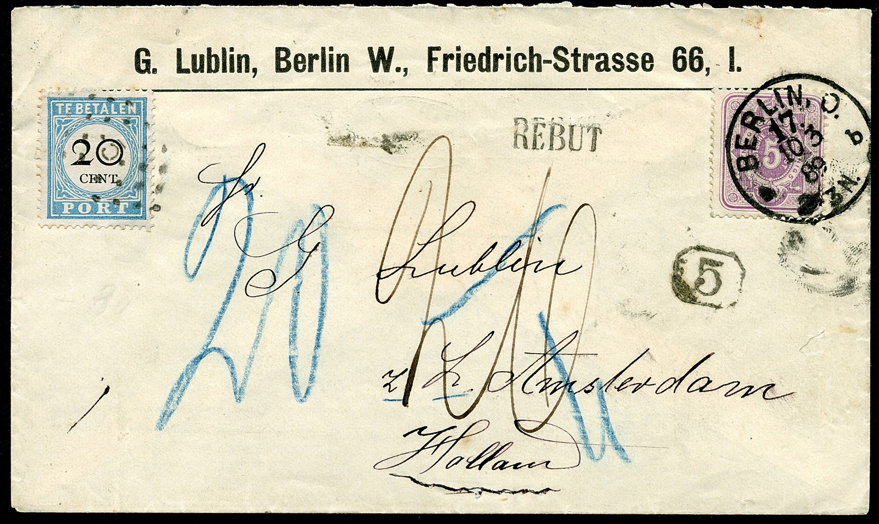 Env. ontoereikend gefr. met 5pf van Berlijn 10-3-1889 naar Amsterdam, beport met 20 cent, maar onbestelbaar met op az. 14 bestellersstempels, ´Inconnu´ in kader, en ovaalstempel ´Afgeschreven Amsterdam´ en op vz. ´Rebut´
